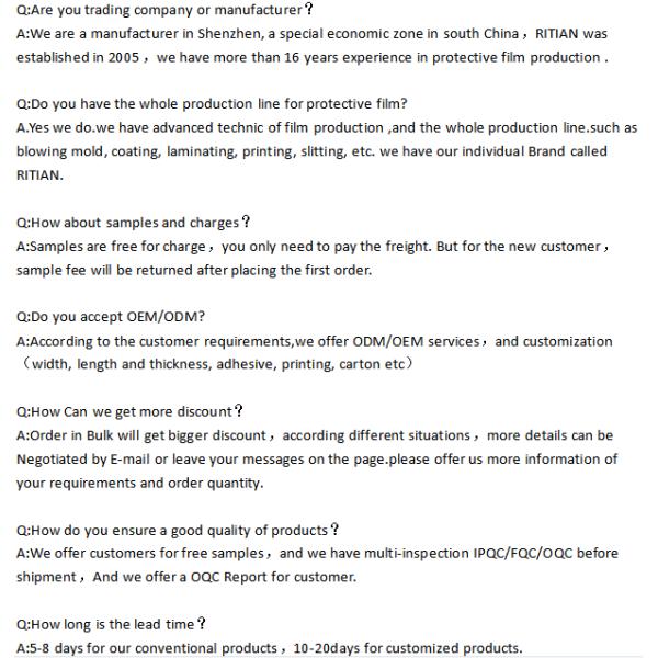 16Years Experiences -- RITIAN TECHNOLOGY was established in 1995, covers an area of 10,000 square meterfactory and gain so much praise from our customers. Our group was certificated by ISO9001,and all the protectivefilms we produced had Rohs and SGS certifications.